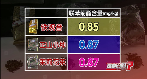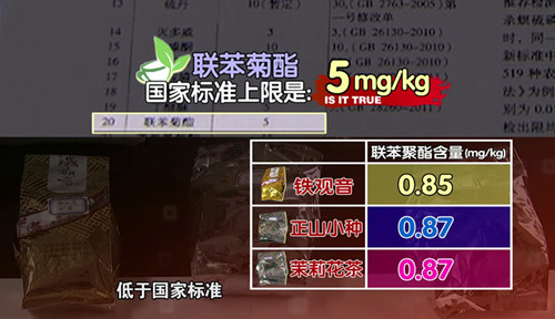 這次實驗以聯苯菊酯為例進行對比檢測,檢測結果顯示鐵觀音聯苯菊酯的含量為0.85毫克每千克、正山小種含量為0.87毫克每千克、茉莉花茶含量為0.87毫克每千克。這樣的結果是否符合國家的標準呢?趙建莊表示,食品安全國家標準里,茶葉涉及到的農藥聯苯菊酯最高殘留限量是5毫克每千克,記者購買來的樣品中的農藥殘留不到食品安全國家標準的五分之一。
