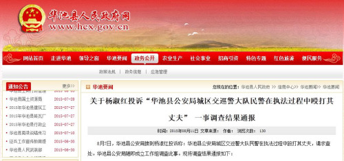 華池縣委宣傳今天通報(bào)調(diào)查結(jié)果,通報(bào)稱,8月7日,華池縣公安局接到楊淑紅投訴稱:華池縣公安局城區(qū)交巡警大隊(duì)警察在執(zhí)法過(guò)程中毆打其丈夫,請(qǐng)求查處。華池縣公安局隨即成立工作組調(diào)查此事。