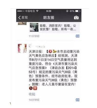 辟謠:有網(wǎng)友誤以為,此次重污染天氣黃色應(yīng)急響應(yīng)與爆炸有關(guān),其實這是天津日報本月11日(也就是前天)發(fā)布的消息,與此次爆炸事件并無關(guān)聯(lián)。