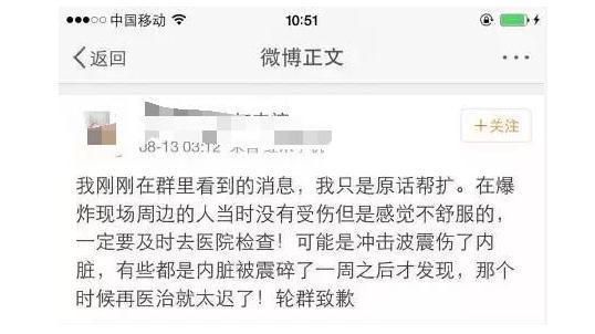 澄清:這篇微博的始發(fā)者@竹子賢,稱自己的朋友是護士,在爆炸現(xiàn)場。事實是,假的。當(dāng)事人目前已將微博清空。