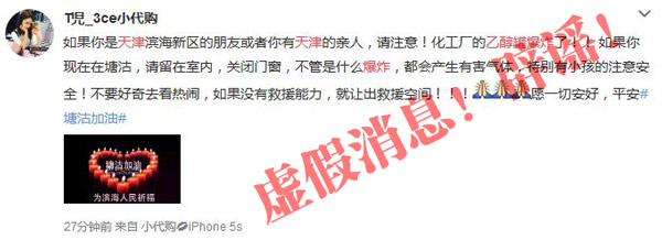 辟謠:天津市公安局網(wǎng)絡(luò)安全保衛(wèi)總隊官方微博“天津網(wǎng)警巡查執(zhí)法”稱該傳聞系謠言。回應(yīng):“災(zāi)難面前,我們攜手度過,不傳謠不造謠,等待官方信息,等待真相,就是對逝者最大的尊重,對現(xiàn)場救援人員最大的支持! ”