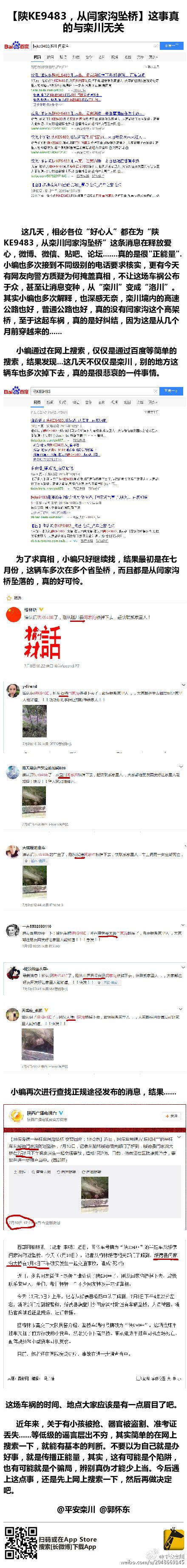 近期,一則“陜KE9483從甘肅秦安洛川閆家溝墜橋”的消息在微博、微信、貼吧、論壇傳播。事實上,洛川根本沒有閆家溝高架橋。正式有記載的是在7月8日,榆林綏德發生一起車禍。