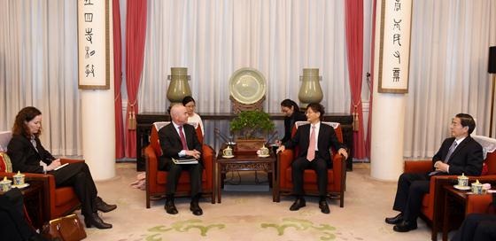 中共中央政治局委員、中央政法委書記孟建柱11月13日在中南海會見了由美國國土安全部常務副部長馬約爾卡斯率領的美國網絡安全執法跨部門代表團。