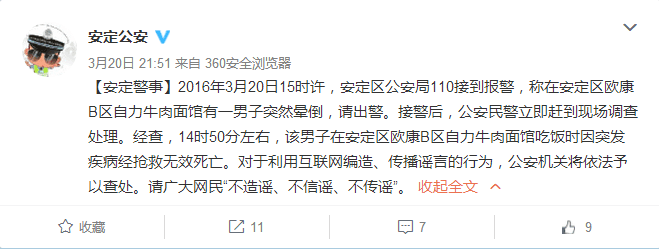 辟謠:安定歐康某牛肉面館一顧客突然死亡情況報告