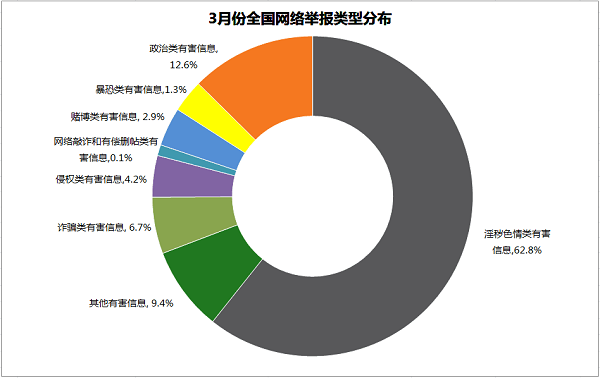 3月份,中國互聯網違法和不良信息舉報中心直接受理、處置網民有效舉報34976件。經核查,會同相關執法部門處置色情、詐騙、賭博網站及鏈接16365條(個);通知新浪微博、鳳凰網、樂視網、好搜、百度等網站、搜索引擎服務商、在線存儲工具服務商刪除色情低俗有害信息8323條;通知豆瓣網、西陸網、鐵血網、優酷網等網站刪除含有血腥殘忍內容,販賣毒藥、槍支的暴恐有害信息1815條;通知新浪、騰訊依法處置傳播虛假信息的博客賬號48個、微博賬號69個;通知騰訊依法處置販賣假幣、違規出售煙草、發布招嫖信息等從事違法活動的即時通信賬號710個;通知網易、鳳凰網、人人網、貓撲網、360DOC、寬帶山社區、東方財富網等網站刪除歪曲黨史國史、捏造京港澳高速油罐車爆炸事故傷亡人數等虛假信息、網絡謠言7646條。