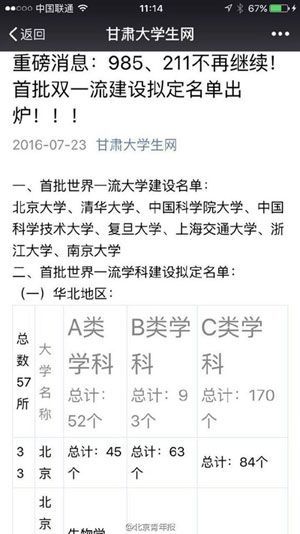 【教育部否認發布“雙一流”大學名單,勿輕信網傳】近兩日,網絡流傳出一份“首批雙一流建設擬定的大學名單”,名單稱北大清華8所大學被確定為首批一流大學,華北地區共有57個一流學科,該名單流傳于各大網絡論壇。教育部新聞發言人續梅今日獨家回應北青報記者,“目前教育部正與相關部門抓緊研究制定統籌推進世界一流大學和一流學科建設實施辦法,爭取盡早出臺。教育部從未發布過雙一流名單,還請大家不要輕信。”