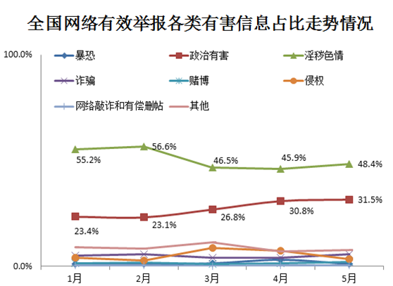 此外,詐騙類有害信息舉報占5.6%,侵犯網民權類有害信息舉報占3.3%,賭博類有害信息舉報占2.0%,暴恐類有害信息舉報占1.1%,網絡敲詐和有償刪帖類有害信息舉報占0.5%,其他有害信息舉報占7.6%。