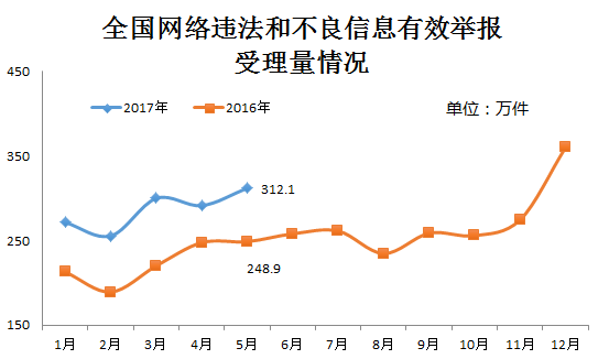 截至5月底,全國網絡舉報部門直接處置或向執法部門轉交網民有效舉報約301.2萬件,通過各類渠道向網民反饋處置結果296.2萬件。其中,中國互聯網違法和不良信息舉報中心直接受理有效舉報70255 件,環比增長約23.4%,同比增長一倍多;各地網信辦舉報部門受理有效舉報約87.3萬件,環比增長10.9%,同比增長9倍多;全國主要網站受理有效舉報約217.8萬件,環比增長5.2%,同比下降約8.1%。