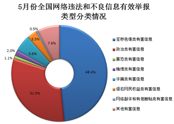 在全國網絡違法和不良信息有效舉報中,淫穢色情類有害信息舉報較為集中,達140萬件,占48.4%;政治類有害信息舉報占31.5%,占比連續三個月增長。