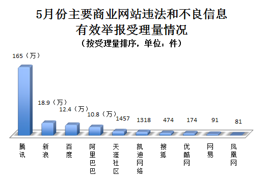 騰訊、新浪、百度、阿里巴巴等主要商業網站受理違法和不良信息有效舉報207.4萬件,處置或向執法部門轉交199.4萬件。其中,騰訊受理有效舉報約165萬件(微信84.6萬件、QQ74.1萬件、網站舉報專區3.9萬件、騰訊網1.7萬件、騰訊微博6104件),新浪受理有效舉報18.9萬件(新浪微博15.7萬件、新浪網3.2萬件),百度受理有效舉報12.4萬件,阿里巴巴受理有效舉報10.8萬件,天涯社區受理有效舉報1457件,凱迪網絡受理有效舉報1318件,搜狐網受理有效舉報474件,優酷網受理有效舉報174件,網易網受理有效舉報91件,鳳凰網受理有效舉報81件。