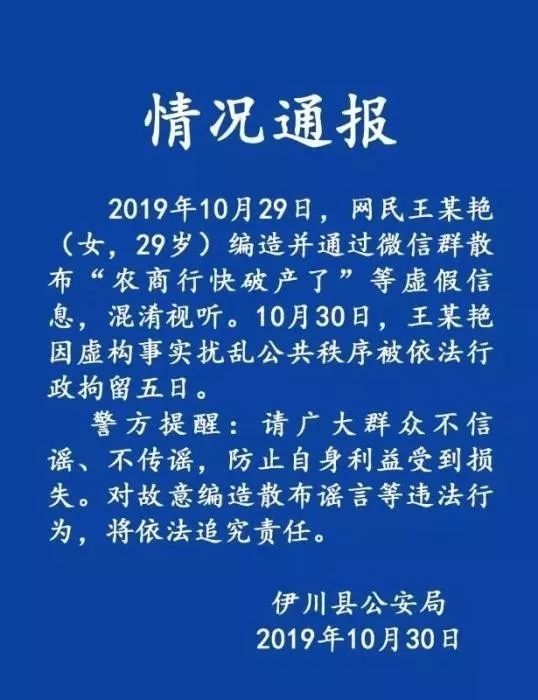 10月29日,河南一女子編造散布“河南洛陽伊川縣農(nóng)商銀行各營業(yè)網(wǎng)點(diǎn)多名儲(chǔ)戶爭(zhēng)相前往取錢”謠言,并稱“農(nóng)商行要倒閉”。