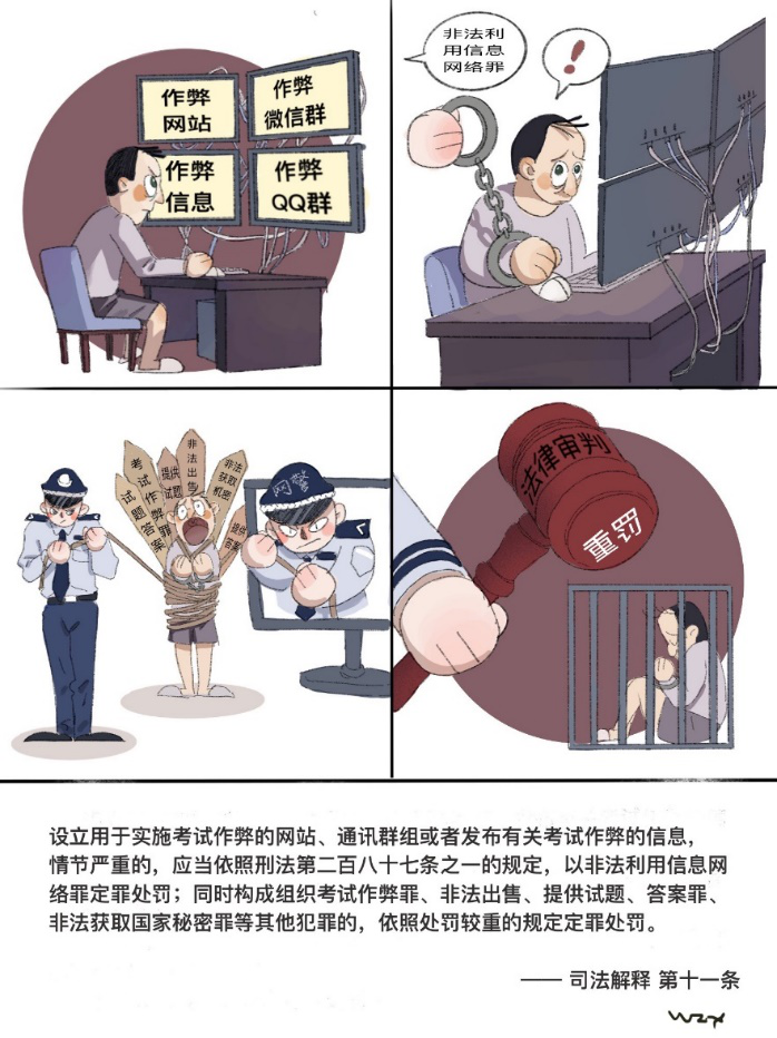 《中華人民共和國刑法》明確規定,在法律規定的國家考試中,“組織作弊的”“為他人提供作弊器材或者其他幫助的”“向他人非法出售或者提供考試的試題、答案的”“代替他人或者讓他人代替自己參加考試的”,都屬于違法犯罪行為。
