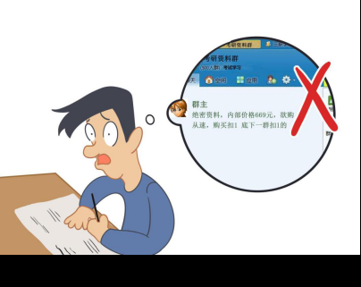 在研考備考期間,一些不良商家往往利用考生復習緊張,無暇搜集備考資料,假以“上岸”學長學姐的身份,宣稱有考研“內部資料”,實際干的卻是騙錢的營生。上當考生不但錢物兩失,還耽誤了考研復習進度。
