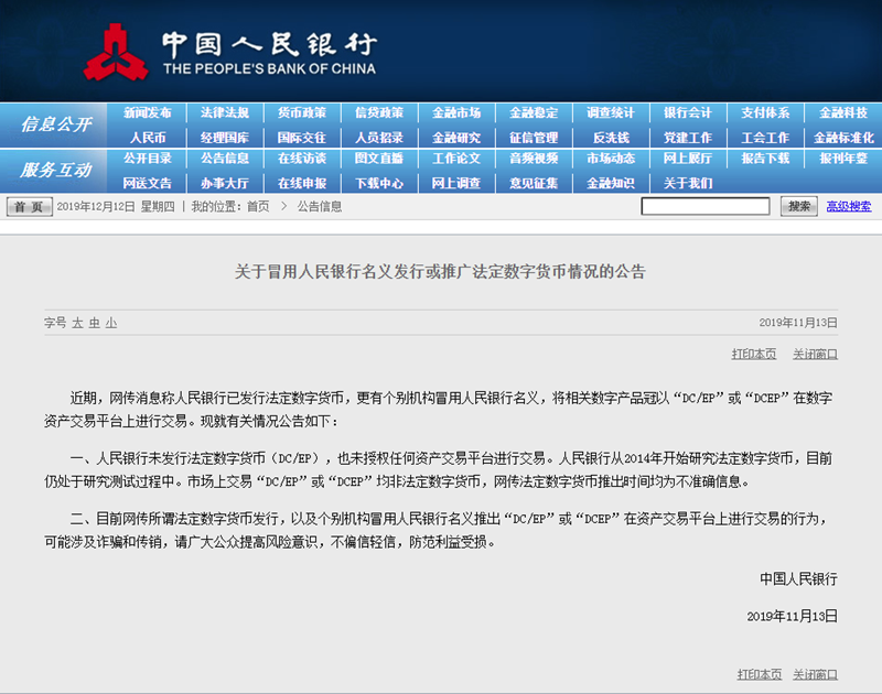 同時,目前網傳所謂法定數字貨幣發行,以及個別機構冒用人民銀行名義推出“DC/EP”或“DCEP”在資產交易平臺上進行交易的行為,可能涉及詐騙和傳銷,請廣大公眾提高風險意識,不偏信輕信,防范利益受損。