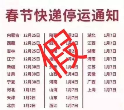 傳聞:一張“春節快遞停運通知”的圖片在網上流傳,圖片標注了春節期間全國各地快遞停發日期。