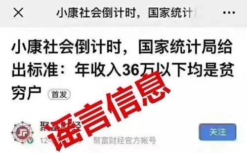 傳聞:網傳信息以“小康社會進入倒計時,國家統計局給出標準:年收入36萬以下均是貧窮戶”為題,稱國家統計局提出了所謂富豪家庭、富裕家庭、中產家庭等收入標準。
