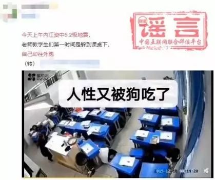 傳聞:12月18日,四川內江市資中縣發生5.2級地震。地震之后,一段“地震來襲,老師組織學生躲到課桌下,自己卻向外跑去”的視頻在網上流傳。