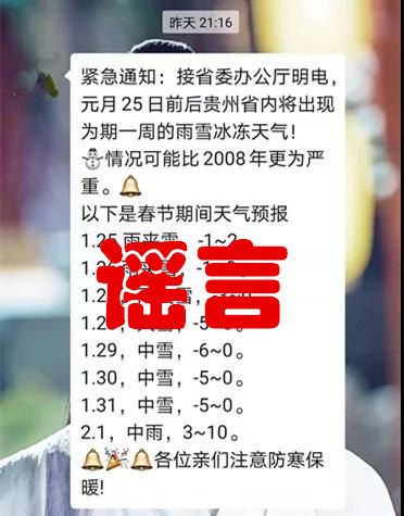 而且這條謠言的消息只有時間和粗略的天氣現(xiàn)象,并不符合正規(guī)消息格式。且貴州省有17.6167萬平方公里,素有“一山有四季、十里不同天”之稱,不可能全省氣溫都一樣,這條消息很明顯是謠言。