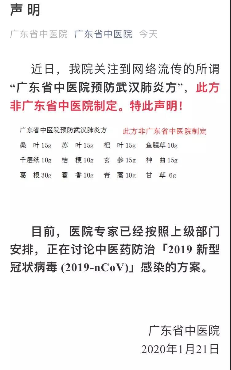 日前,微信群里流傳一份“廣東省中醫院預防武漢肺炎方”,前日(21日),廣東省中醫院在官方微信發布聲明辟謠,稱此方非廣東省中醫院制定。