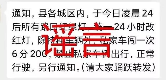 謠言三:“所有路口紅綠燈統一改紅燈”“禁止私家車輛出行”。