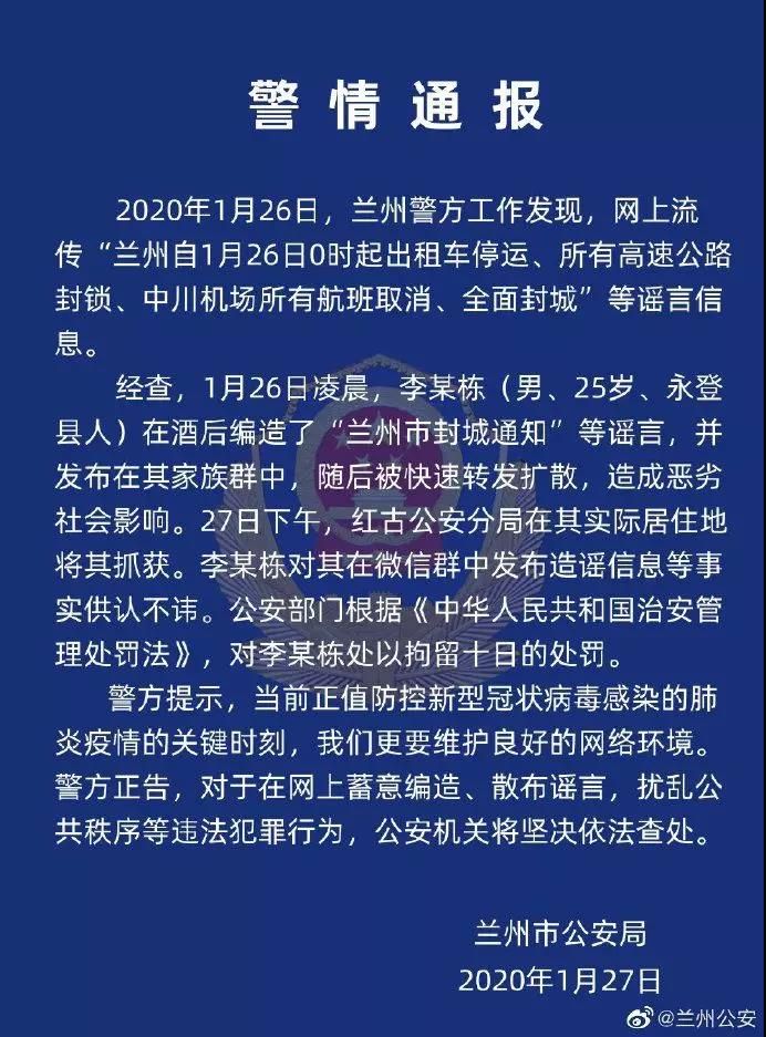 經蘭州市公安局核查,系李某棟在酒后編造了“蘭州市封城通知”等謠言,并發布在其家族群中,隨后被快速轉發擴散,造成惡劣社會影響。公安機關對違法行為人處以拘留十日的處罰。