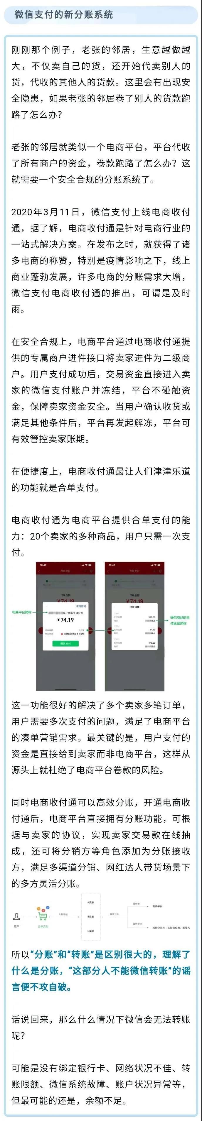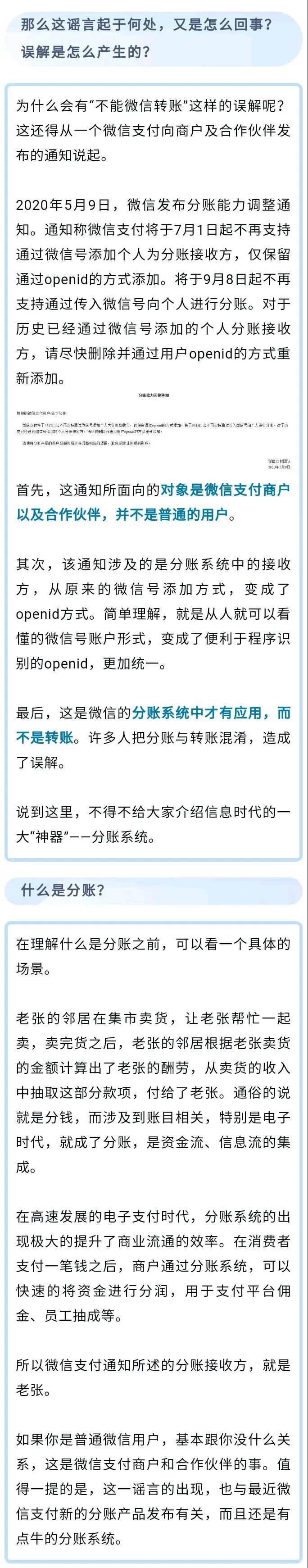 微信官方辟謠稱,該內容所謂“這部分人不能微信轉賬”存在嚴重誤讀。分賬是微信支付商戶資金流轉的一個環節,不同于普通用戶之間的轉賬,個人轉賬規則并無變化。