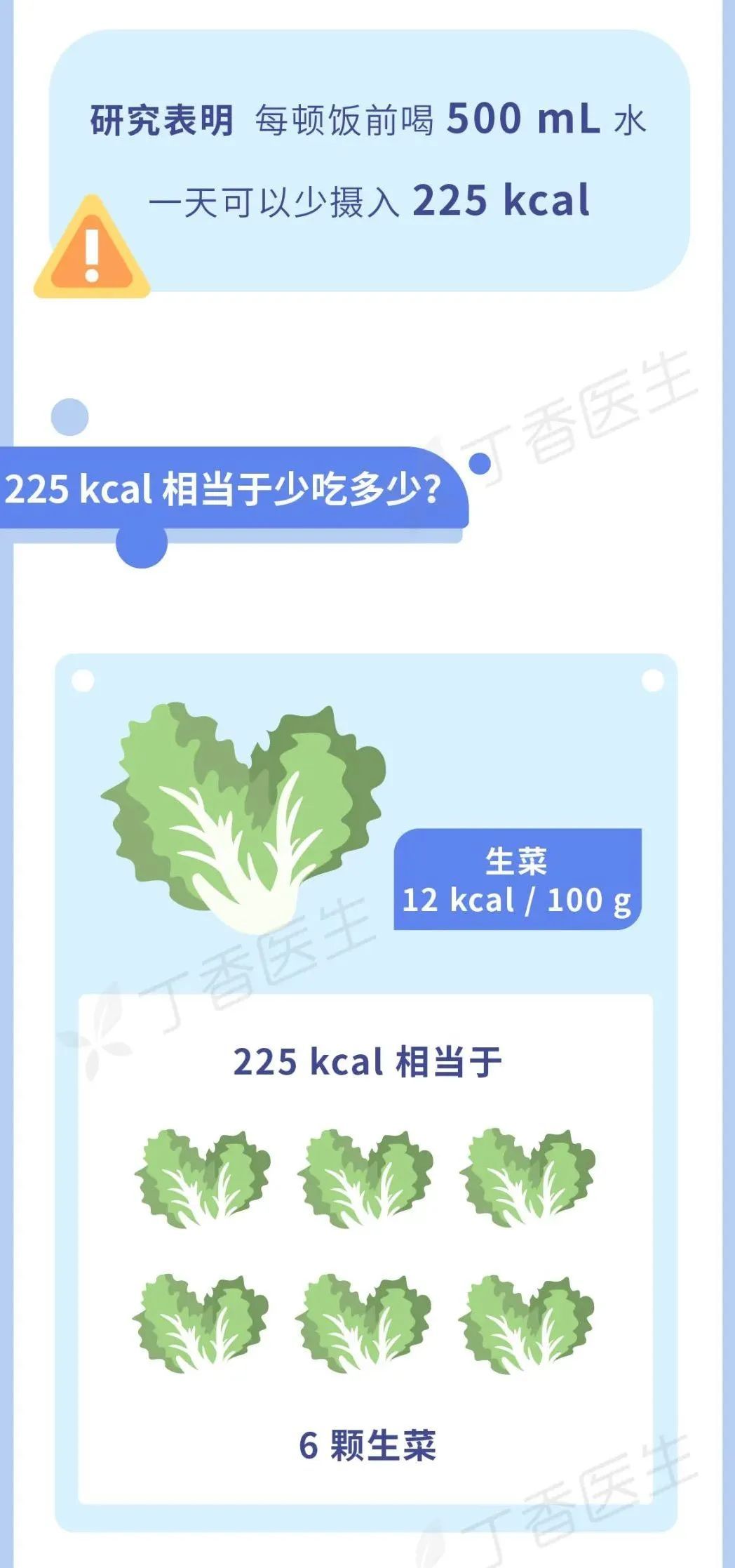 算下來,如果一日三餐飯前都喝點水,那一天最多可以少吃225千卡的熱量。