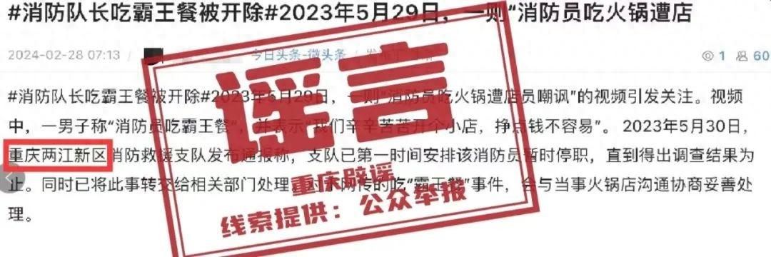 經核實,重慶兩江新區消防救援支隊從未發生過消防員吃“霸王餐”的情況,也未在網上發布過關于因吃“霸王餐”安排消防員暫時停職的通報。