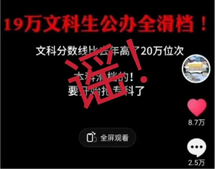 真相:近日,2024年山東高考普通批投檔線公布,一則網傳“山東19萬文科考生滑檔”的消息引起網民關注,加重考生及家長的擔憂,甚至引發很多人對招生政策合理性的質疑。經山東濟南公安部門調查,謠言散布者任某某就職于某教育科技有限公司,該公司主要從事高考志愿導航和復讀推介業務。為了博取眼球、招攬生意,任某某在社交平臺發布了以上虛假短視頻。目前,任某某因虛構事實擾亂公共秩序,被依法處以治安拘留5日的處罰。(來源:山東互聯網聯合辟謠平臺、公安部網安局)