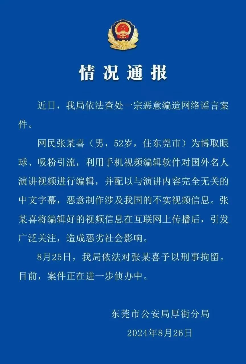 網民張某喜(男,52歲,住東莞市)為博取眼球、吸粉引流,利用手機視頻編輯軟件對國外名人演講視頻進行編輯,并配以與演講內容完全無關的中文字幕,惡意制作涉及我國的不實視頻信息。張某喜將編輯好的視頻信息在互聯網上傳播后,引發廣泛關注,造成惡劣社會影響。