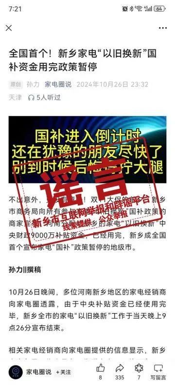 10月26日,有網(wǎng)民在多平臺(tái)發(fā)布關(guān)于“全國(guó)首個(gè)!河南新鄉(xiāng)家電以舊換新國(guó)補(bǔ)資金用完政策暫停”的文章,聲稱(chēng)“國(guó)補(bǔ)末班車(chē)即將結(jié)束”“中央財(cái)政9000萬(wàn)補(bǔ)貼資金已經(jīng)用完”等內(nèi)容。經(jīng)查,該信息系謠言。