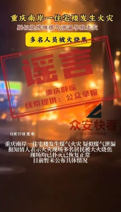 27日,有自媒體發布視頻稱“南岸一住宅樓發生煤氣火災,火災現場多名居民被大火燒焦”“南坪大火現已失去生命19人”,引發關注。
