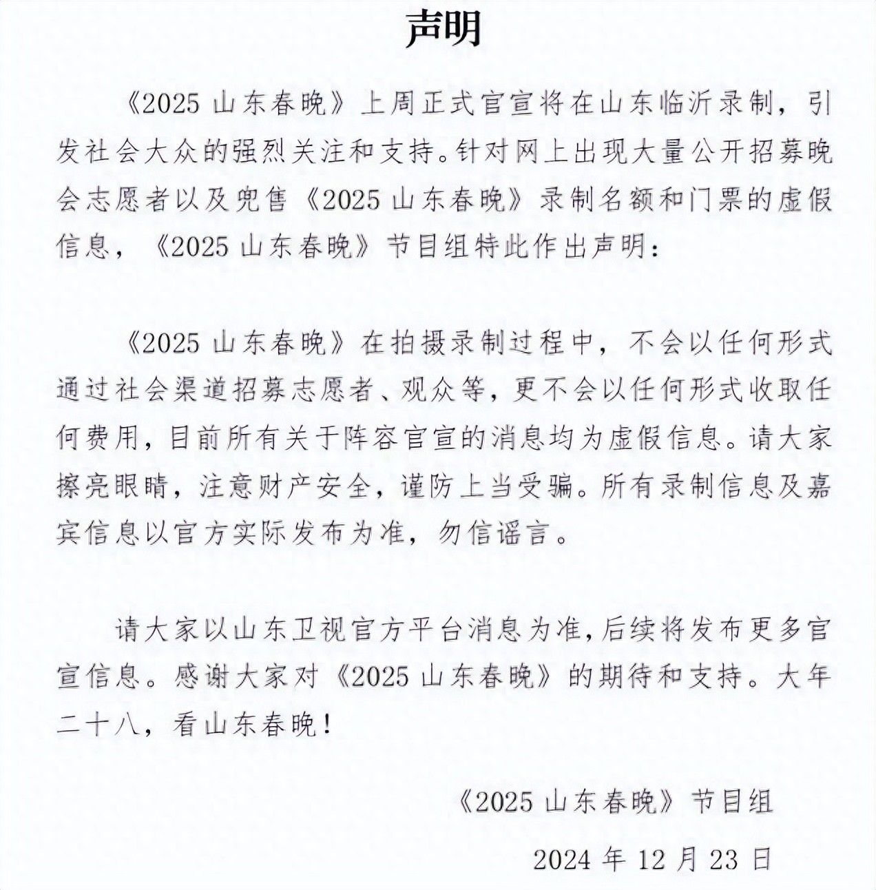 《2025山東春晚》上周正式官宣將在山東臨沂錄制,引發(fā)社會(huì)大眾的強(qiáng)烈關(guān)注和支持。針對(duì)網(wǎng)上出現(xiàn)大量公開招募晚會(huì)志愿者以及兜售《2025山東春晚》錄制名額和門票的虛假信息,《2025山東春晚》節(jié)目組特此作出聲明。春晚節(jié)目組提醒廣大網(wǎng)民不要相信、謹(jǐn)防受騙。