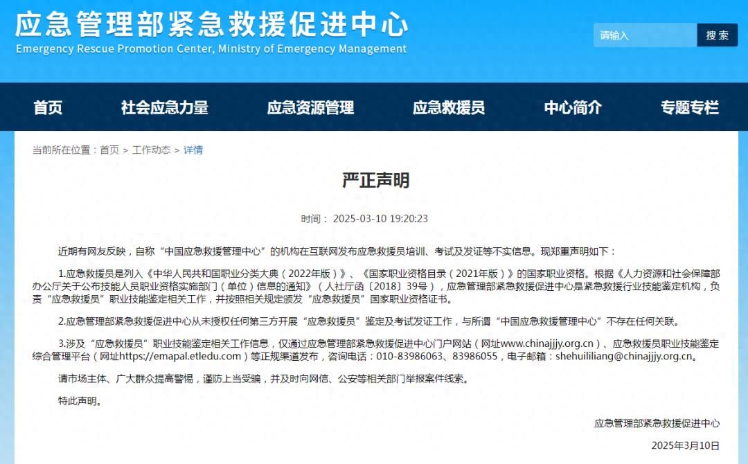 近期有網(wǎng)友反映,自稱(chēng)“中國(guó)應(yīng)急救援管理中心”的機(jī)構(gòu)在互聯(lián)網(wǎng)發(fā)布應(yīng)急救援員培訓(xùn)、考試及發(fā)證等不實(shí)信息。現(xiàn)鄭重聲明如下: