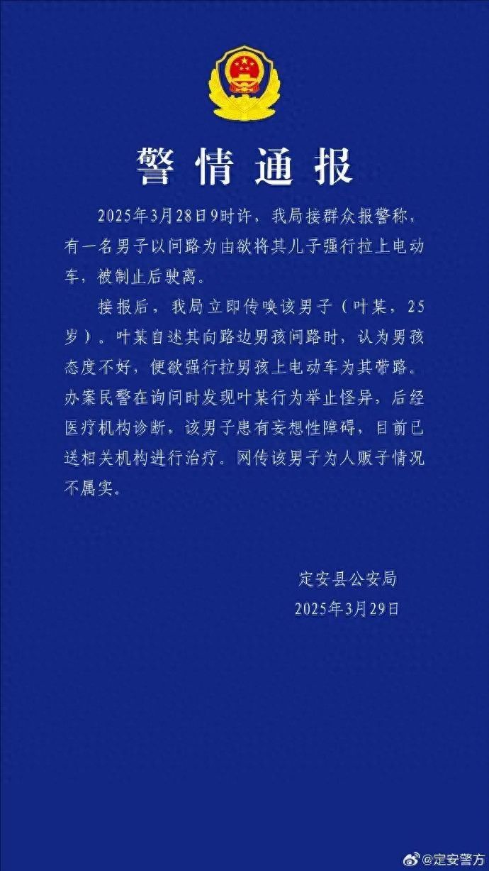 接報后,定安縣公安局立即傳喚該男子(葉某,25歲)。葉某自述其向路邊男孩問路時,認(rèn)為男孩態(tài)度不好,便欲強(qiáng)行拉男孩上電動車為其帶路。辦案民警在詢問時發(fā)現(xiàn)葉某行為舉止怪異,后經(jīng)醫(yī)療機(jī)構(gòu)診斷,該男子患有妄想性障礙,目前已送相關(guān)機(jī)構(gòu)進(jìn)行治療。網(wǎng)傳該男子為人販子情況不屬實(shí)。