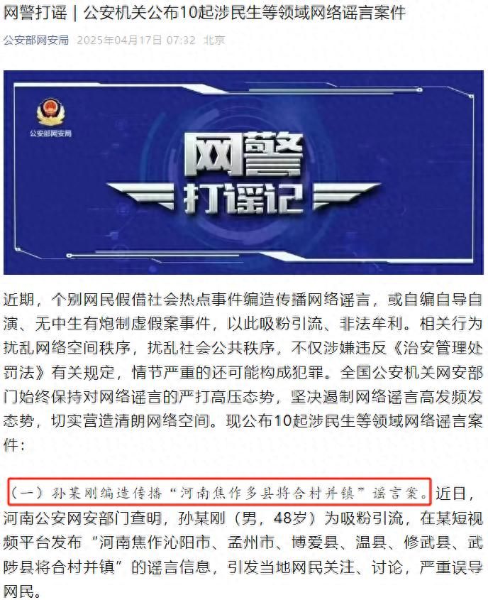 近日,網民孫某剛編造并傳播“河南焦作多縣將合村并鎮”虛假消息。4月10日,中國互聯網聯合辟謠平臺發布“今日辟謠榜”【今日辟謠(2025年4月10日)】進行辟謠,澄清事實,以正視聽。目前,該事件有了后續處理結果,孫某剛因編造散布謠言被依法處罰。