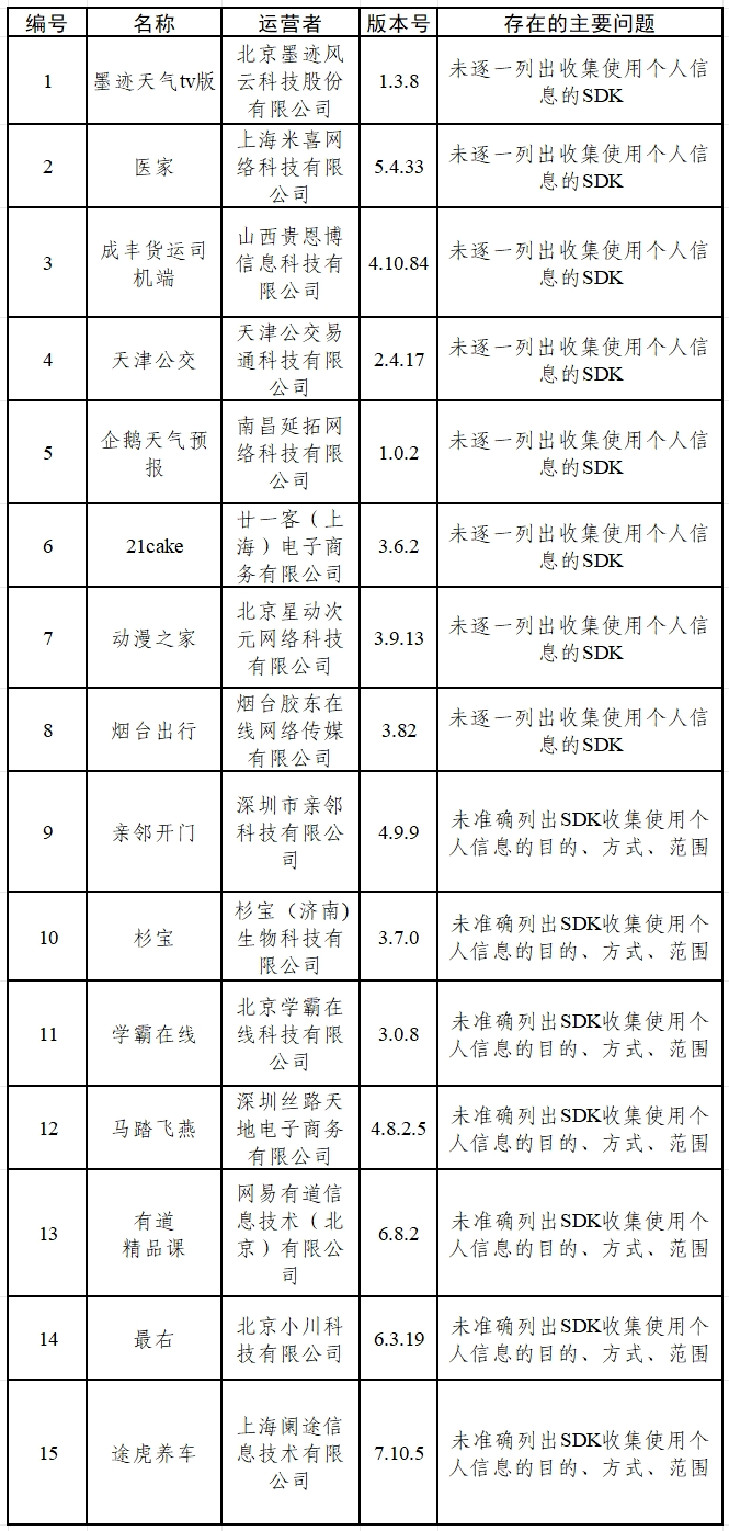 一、墨跡天氣tv版、醫家等15款App存在未逐一列出收集使用個人信息的SDK,未準確列出SDK收集使用個人信息的目的、方式、范圍等問題(詳見下表)。