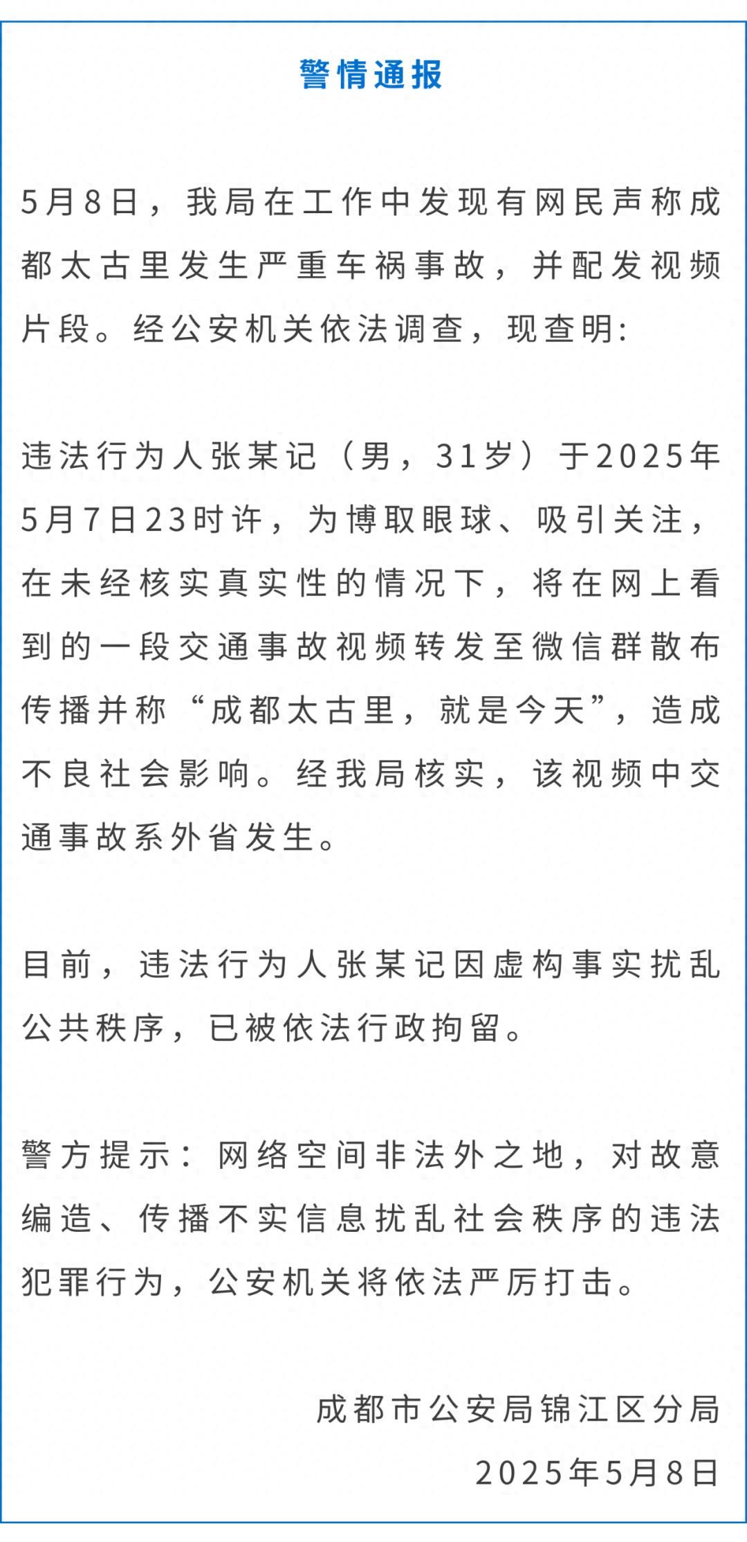 5月8日,成都市公安局錦江區分局通過微信公眾號“成都錦江公安”發布警情通報,全文如下: