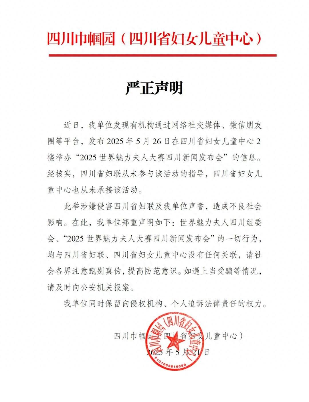 近日,我單位發現有機構通過網絡社交媒體、微信朋友圈等平臺,發布2025年5月26日在四川省婦女兒童中心2樓舉辦“2025世界魅力夫人大賽四川新聞發布會”的信息。經核實,四川省婦聯從未參與該活動的指導,四川省婦女兒童中心也從未承接該活動。