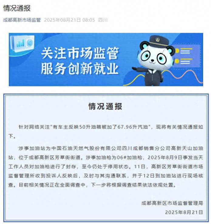 涉事加油站為中國石油天然氣股份有限公司四川成都銷售分公司高新天山加油站,位于成都高新區(qū)芳草街街道。涉事加油槍為06#加油槍,2025年8月9日事發(fā)當(dāng)天工作人員對加油槍進(jìn)行了封存,至今仍處于停用狀態(tài)。11日,高新區(qū)芳草街街道市場監(jiān)督管理所收到投訴人反映后,及時與其溝通聯(lián)系,并于12日到加油站進(jìn)行現(xiàn)場核查。目前相關(guān)情況正在全面調(diào)查中,下一步將根據(jù)調(diào)查結(jié)果依法依規(guī)處置。