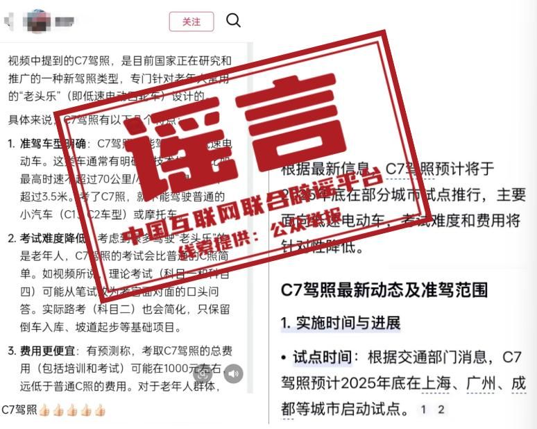 詳情:近日,網上流傳關于上海、廣州、成都等地試點“C7駕照”用于“老頭樂”(四輪低速電動車)的消息,聲稱“2026年初將全國推廣C7駕照,屆時‘老頭樂’需持證上路”“C7 駕照考試極為簡單”,甚至編造“C7駕照科目一考口試”等考試細節。據中央廣播電視總臺中國之聲《新聞晚高峰》報道,相關城市公安交管部門予以明確否認,所謂“上海、廣州等地試點‘老頭樂’C7駕照”不實。相關信息多由四輪低速電動車行業的營銷號發布,目前沒有設立“C7駕照”,C類駕駛證僅涵蓋C1-C6車型,有關營銷號發布的內容為虛假宣傳。(來源:中央廣播電視總臺中國之聲、央廣網)
